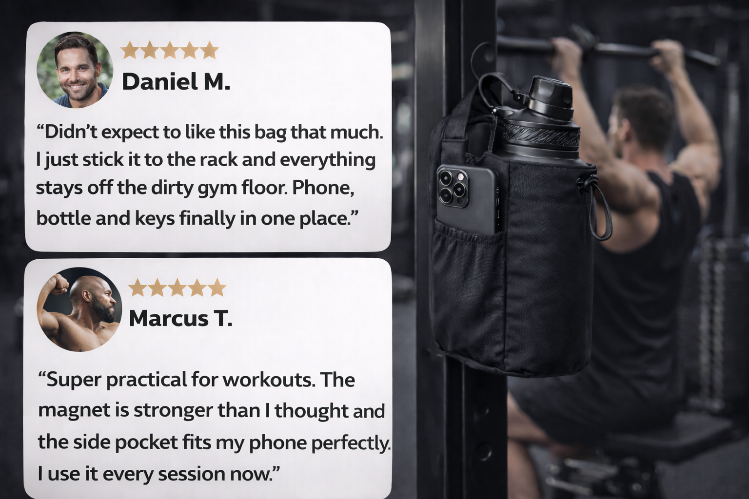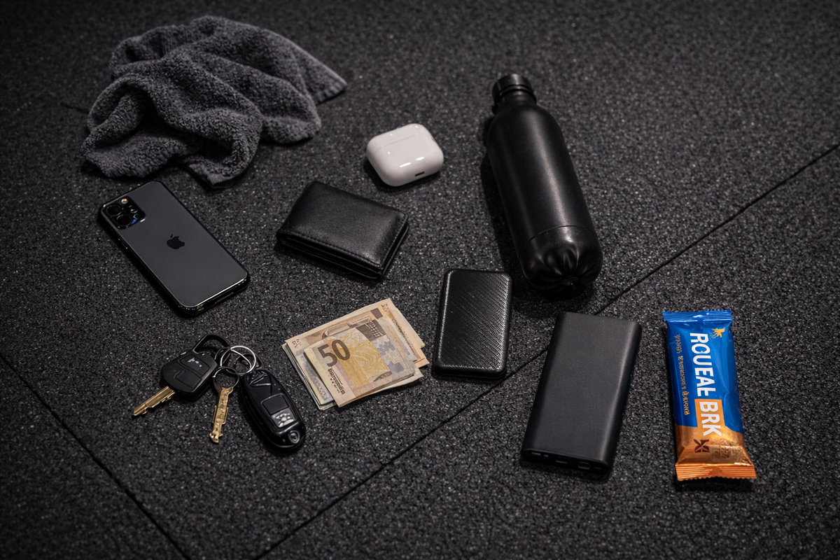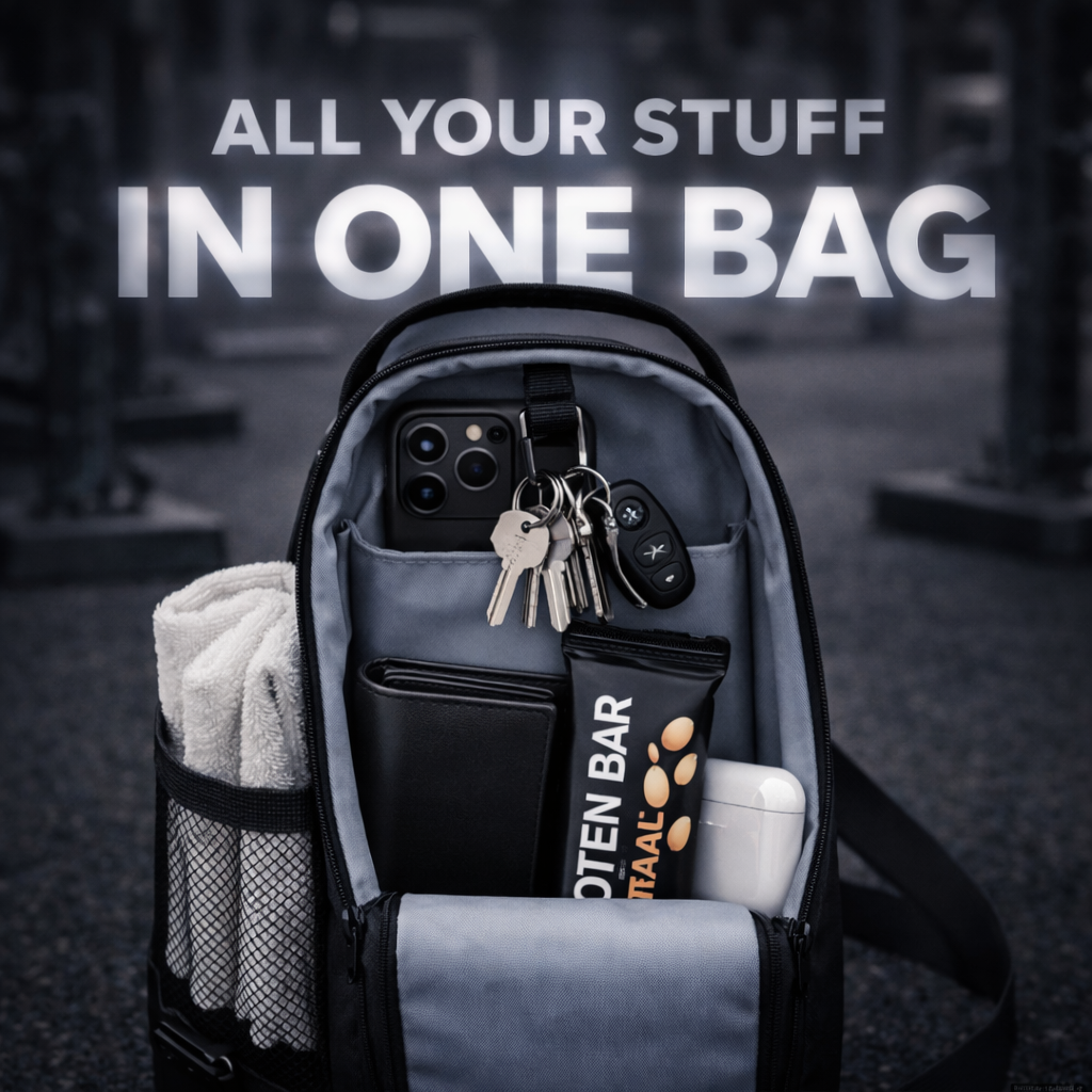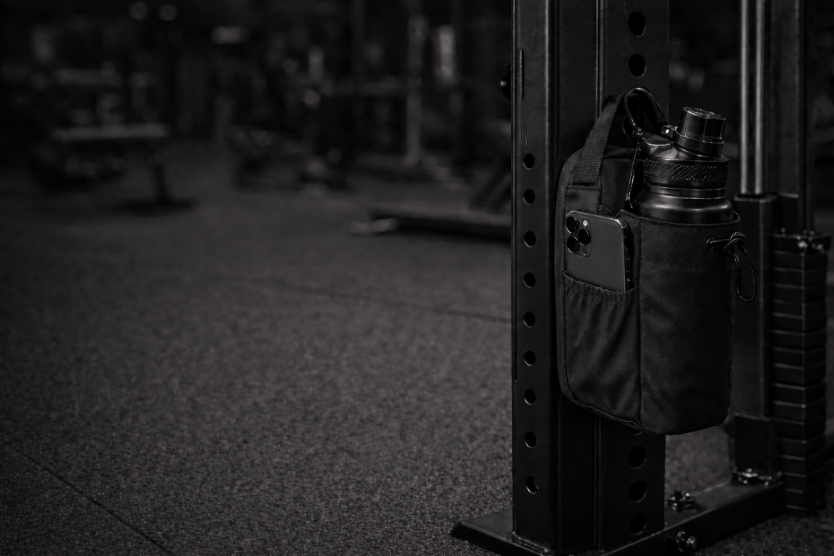 The compact gym organizer that keeps your bottle, phone, keys and essentials off the floor and right where you need them.